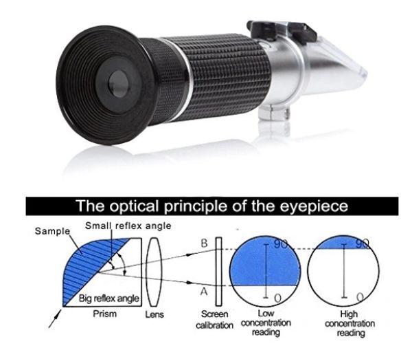 The illustration on the left explains how to use a refractometer and how light refraction measurement works.